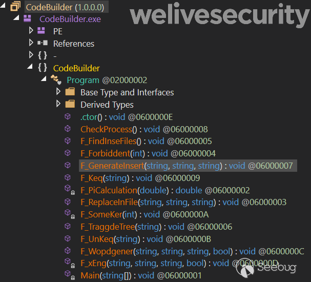 像其他工具一樣,此模塊是在7z自解壓存檔中提供的。里面有一個受密碼保護的RAR存檔,其中包含一些文件。值得注意的是,有兩個文本文件,一個用于Word,一個用于Excel,其中包含要插入目標文檔中的惡意宏的VBA源代碼,以及用于查找和破壞現有文檔的.NET程序集。如圖所示,程序集名稱為CodeBuilder。