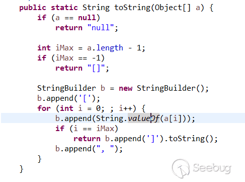 上圖中的argements方法根據右邊的變量調試信息顯示,實際上就是ToStringBean類的實例化對象,其中該對象有兩個參數,beanClass是Class<?>類型,obj是Object類型,此時的調用棧顯示obj是JdbcRowSetImpl實例化對象,beanClass是Class.ForName(“com.sun.rowset.JdbcRowSetImpl”)對象。Array.toString(Object[] obj)方法,將會在底層調用String.valueOf(Object obj),此時這個obj對象是帶有惡意負載的argements對象,繼續往下跟蹤Array.toString將argements向下執行,Array.toString(Object[] obj)方法如下圖所示: