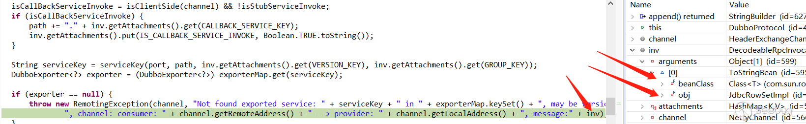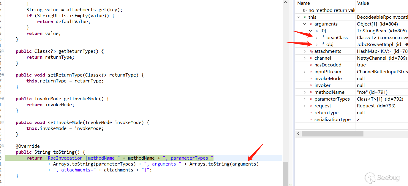 throw new RemotingException ->RpcInvocation.toString()->Arrays.toString()->String.valueOf()->toStringBean.toString()->getter.invoke(obj, NO_PARAMS) 最終在ToStringBean的toString()方法中Invoke動態調用對象造成代碼執行。