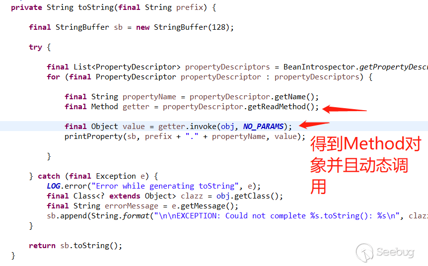 在ToStringBean實現的toString方法中,會遍歷傳入對象的所有方法(Method對象),并且通過java實現的invoke方法動態調用傳入對象的所有Method對象。