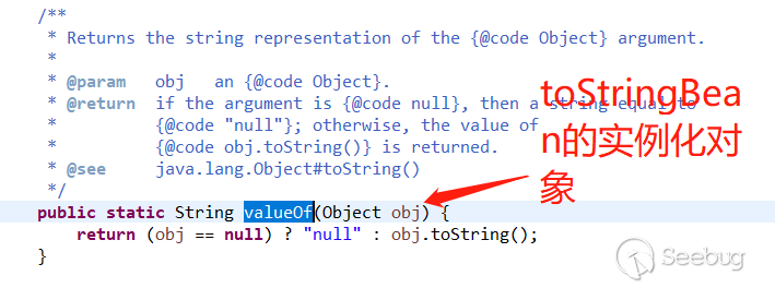 上圖中可以發現傳入的對象最后會經過String.valueOf轉變為字符串儲存在b變量里,繼續往下跟蹤,在String.valueOf方法中,當傳入對象為toStringBean的時候,會調用toStringBean對象的toString()方法,String.valueOf方法如下圖所示: