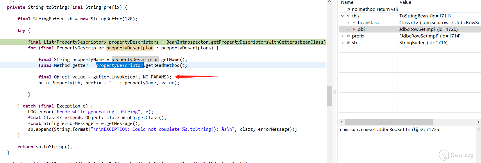 漏洞觸發點在com.rometools.rome.feed.impl.ToStringBean類的toString方法中,toString方法中的getter.invoke(obj, NO_PARAMS);語句,如下圖所示: