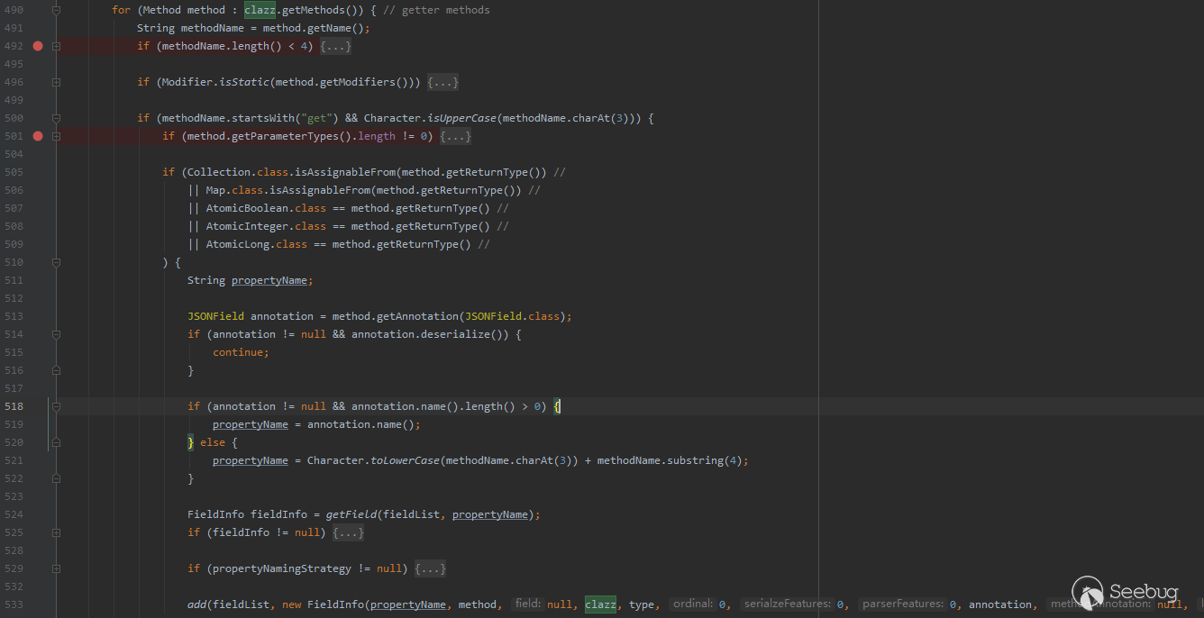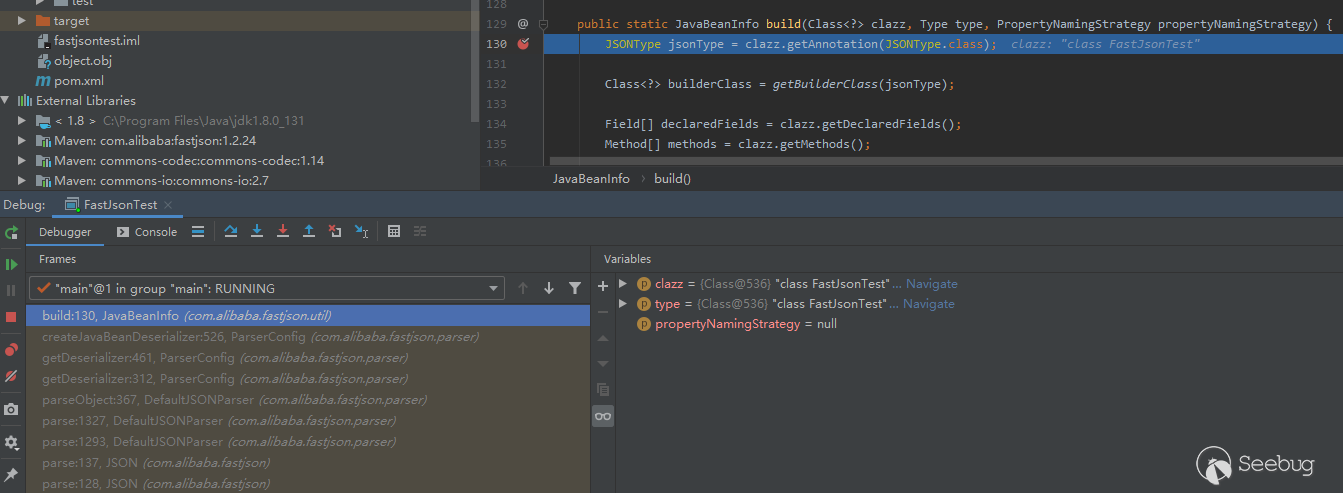 再來看下JSON.parseObject(jsonstr,FastJsonTest.class)這種方式,當程序執行到JavaBeanInfo.build() 方法時情景如下圖