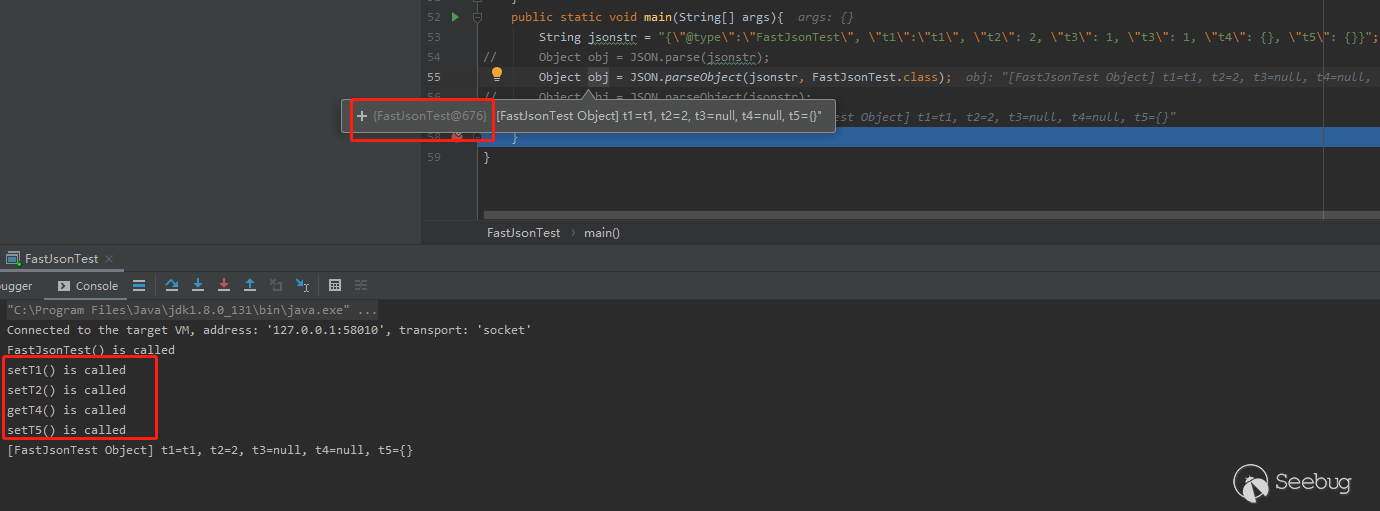 這次結果與上兩次大不相同,FastJsonTest類中的所有getter與setter都被調用了,并且JSON.parseObject(jsonstr);返回一個JSONObject對象