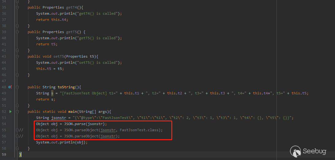 使用JSON.parse(jsonstr)與JSON.parseObject(jsonstr, FastJsonTest.class)兩種方式時,被調用的getter與setter方法分別為setT1() 、setT2()、setT5() 、getT4()。FastJsonTest類中一共有五個getter方法,分別為getT1()、getT2()、getT3()、getT4()、getT5(),為什么僅僅getT4被調用了呢?