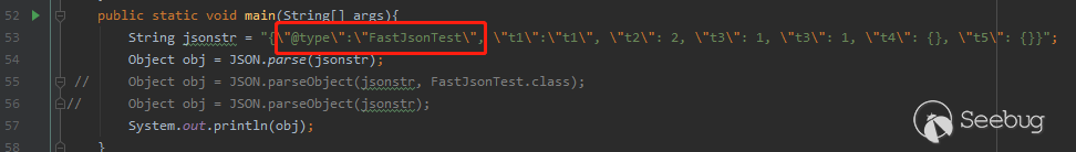 因此,只要Json字符串的\@type字段值與JSON.parseObject(jsonstr,FastJsonTest.class);中第二個參數中類名一致,見下圖