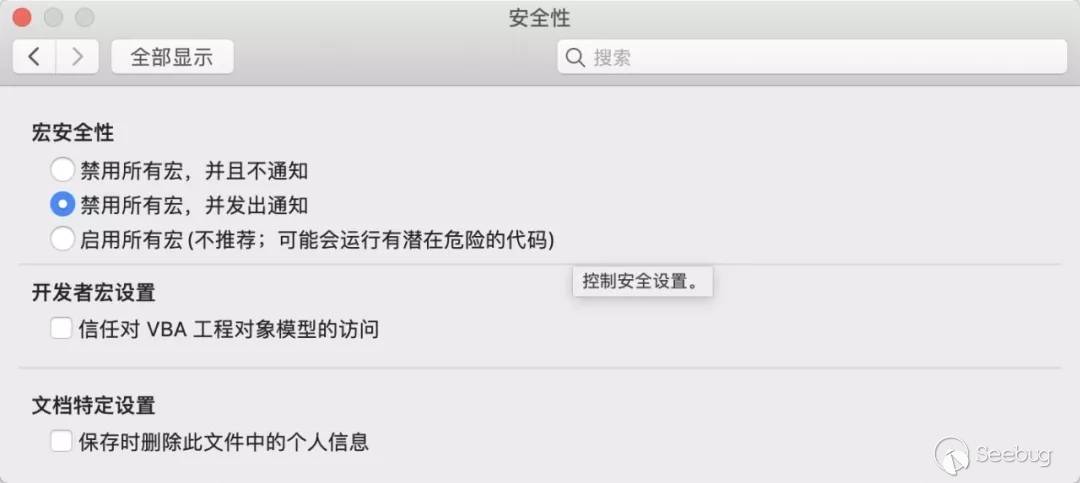 在Mac Office 2011中,打開此文件時不會有任何危險提示,直接運行惡意命令,不過微軟已經停止了對2011的支持,并且網上已經很難下載到2011版本。在Mac Office 2016/2019中(現已修復),若用戶將偏好設置-安全性-宏安全性設置為『禁用所有宏,并且不通知』,惡意宏命令也將自動執行。可惜的是,此設置并非默認的(默認為『禁用所有宏,并發出通知』)。