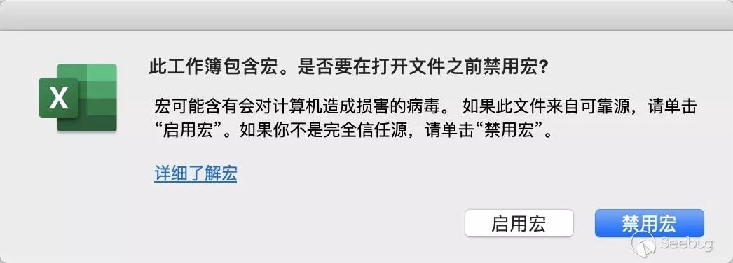 而內置XLM宏的Sylk文件被打開時,Mac Office 2016/2019默認設置下會發出彈窗安全警告: