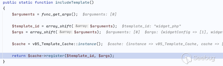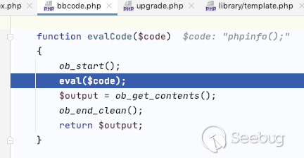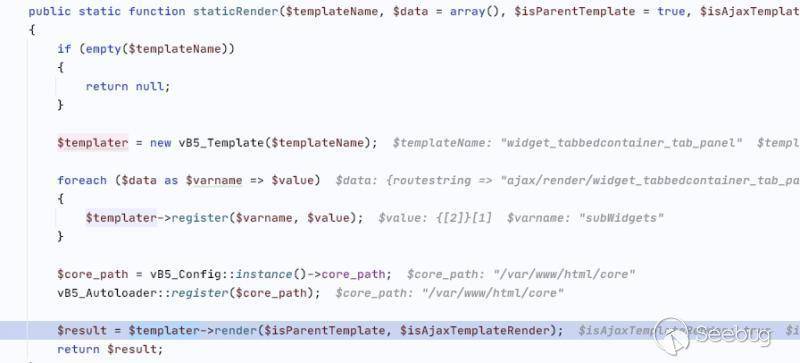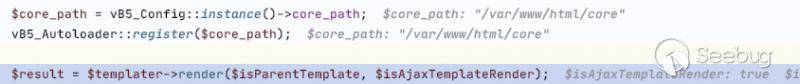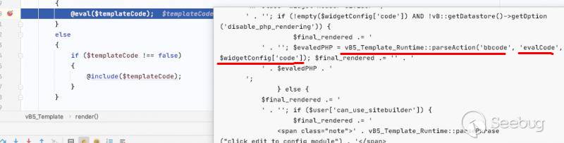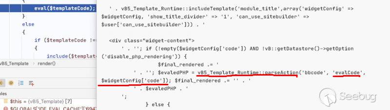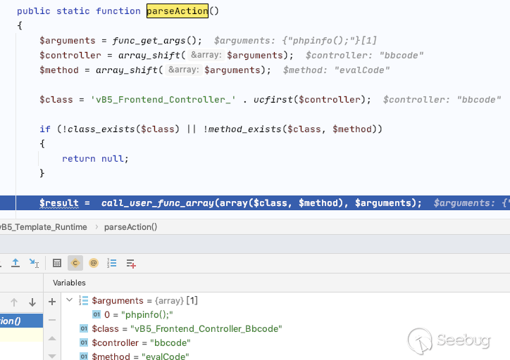 vB5_Template_Runtime::parseAction 該函數雖然沒有函數參數,但是解析了傳遞過來的所有參數到$arguments 變量由 vB5_Frontend_Controller_Bbcode類中的evalCode方法執行所有的參數