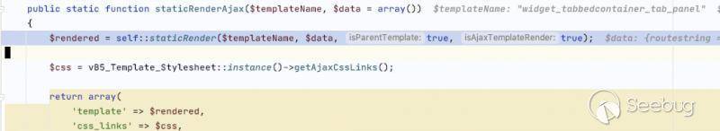 結合前面模板渲染功能分析,可以很快的定位該漏洞。簡要來說該漏洞通過二次渲染再次觸發了CVE-2019-16759漏洞,具體分析如下。