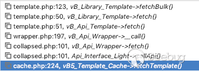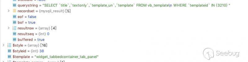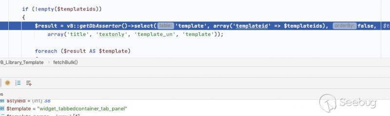 通過一系列調用,到達 template.php:123, vB_Library_Template->fetchBulk(),并在其中利用sql查詢將模板取出。