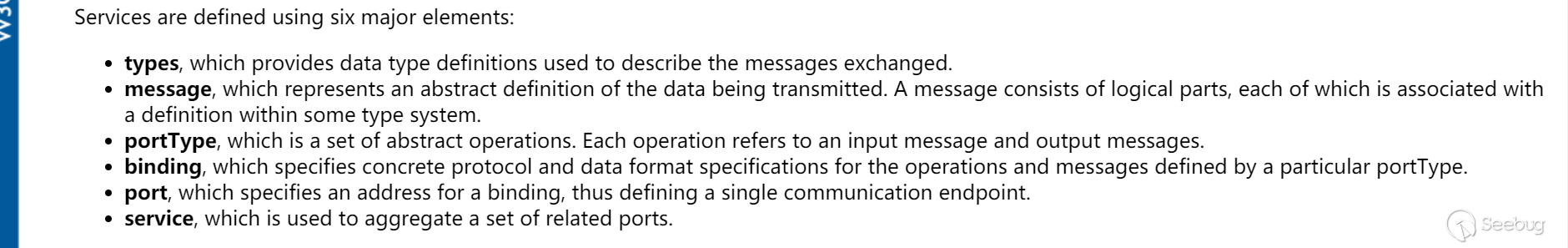 一個 WSDL 文檔通常包含 8 個重要的元素,即 definitions、types、import、message、portType、operation、binding、service 元素,其中 service 元素就定義了各種服務端點,閱讀wsdl時可以從這個元素開始往上讀。