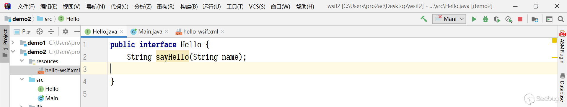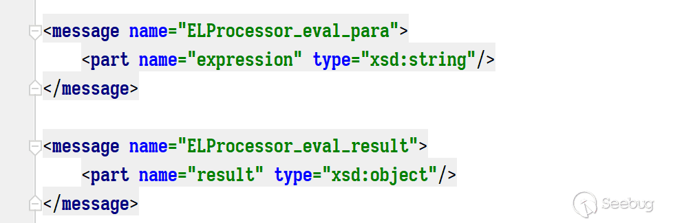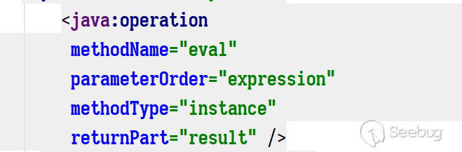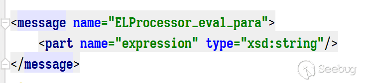 利用鏈中其中一環的限制條件之一是方法中的參數類型、參數數量、參數類型順序必須要與接口定義的一致,本文我們以 String 類型參數為例進行測試,我們寫一個帶有 String 類型的參數接口,來進行跟蹤接口是如何被 WSIF 移花接木到指定的 ELProcessor#eval(String expression)。