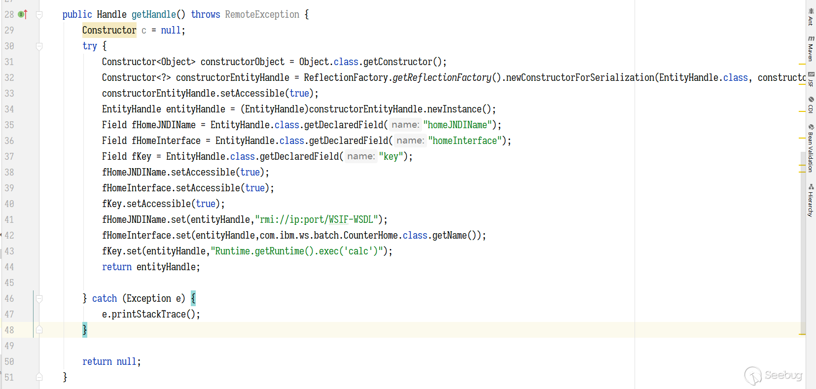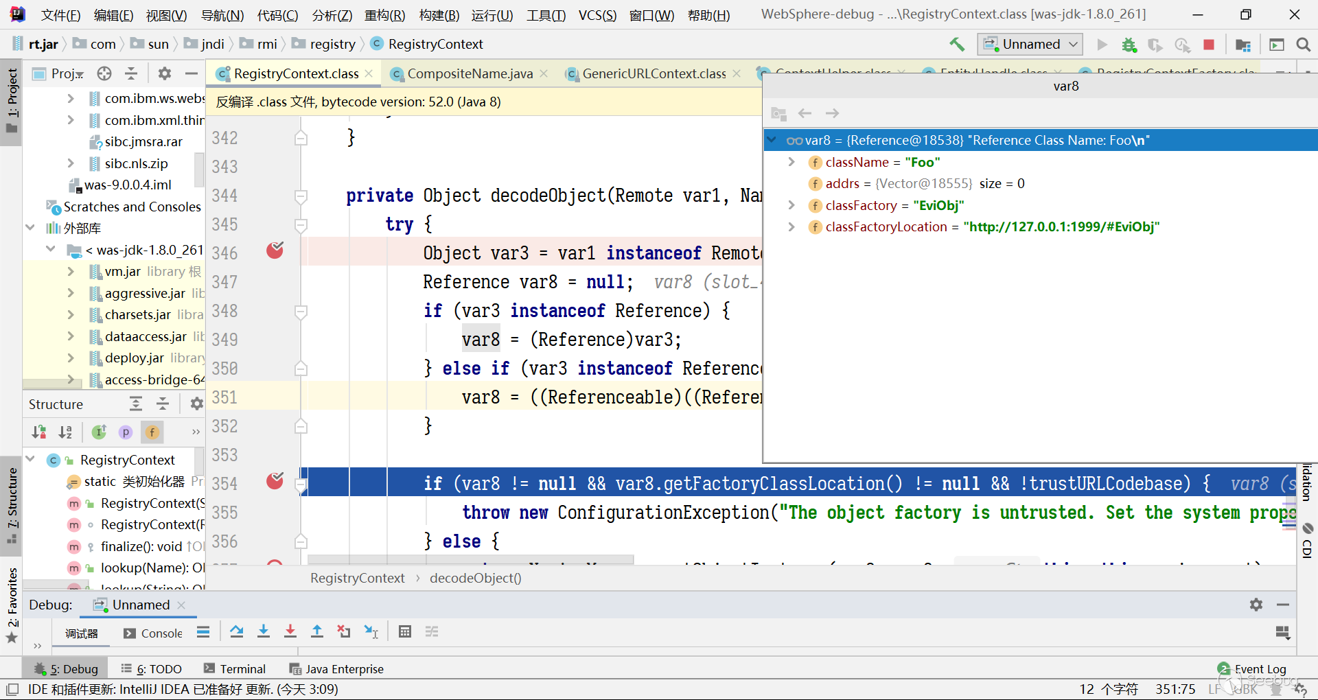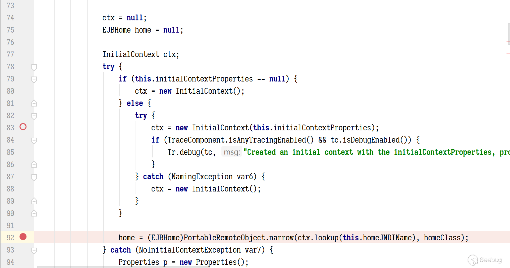 WAS 默認對 RMI/IIOP 開啟了 SSL 和 Basic 認證,前面為了聚焦漏洞我把 WAS 的 SSL 關了,如果沒關,又沒指定 SSL 配置文件的話,直接用互聯網中公開的漏洞利用方案在設置 ServiceContext 時相關的代碼會直接報錯拋出異常。