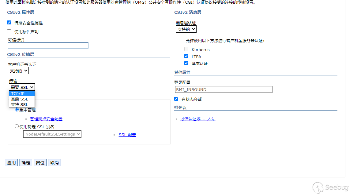 WebSphere 默認情況下,2809、9100 是 IIOP協議交互的明文端口,分別對應 CORBA 的 bootstrap 和 NamingService;而 9402、9403 則為 iiopssl 端口,在默認配置情況下訪問 WebSpere 的 NamingService 是會走 9403 的SSL 端口,為了聚焦漏洞,我們可以先在 Web 控制臺上手動關閉 SSL。
