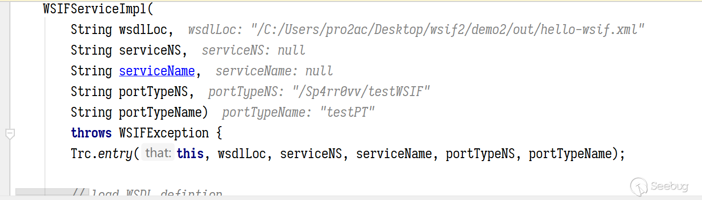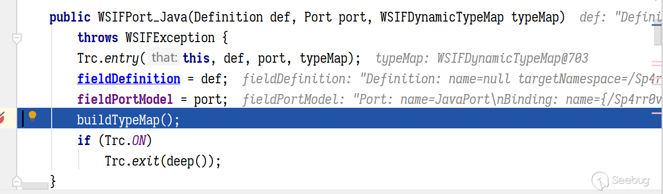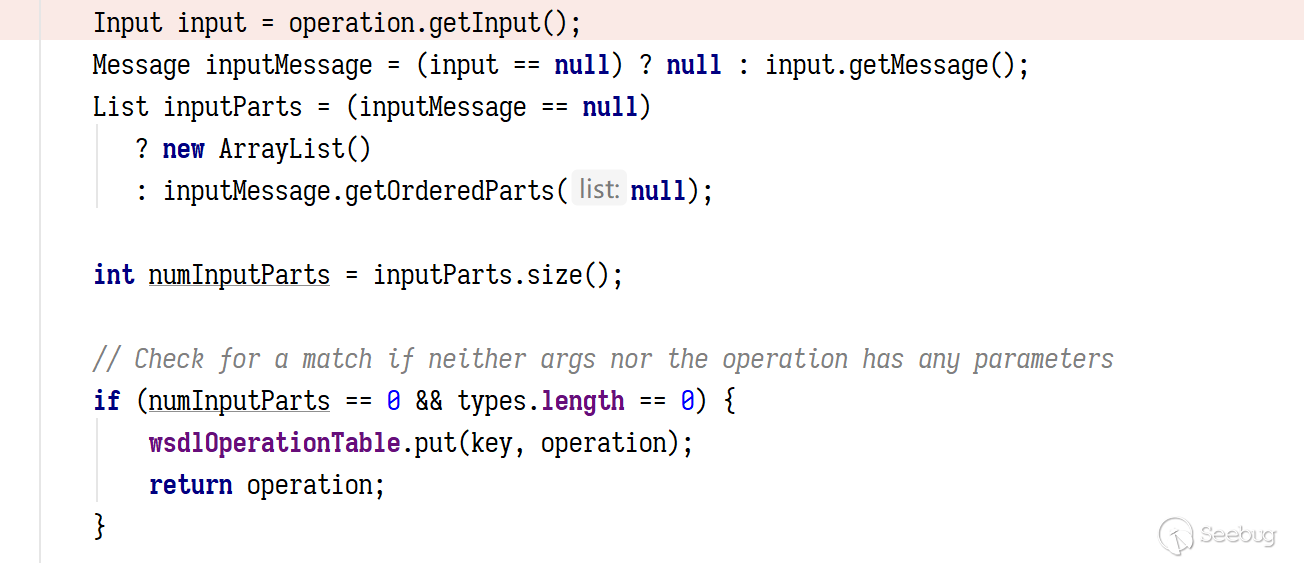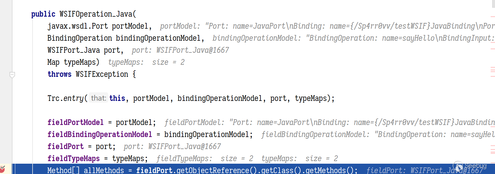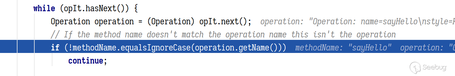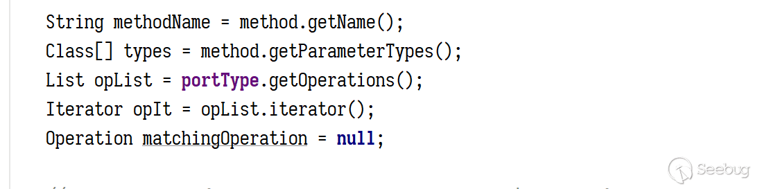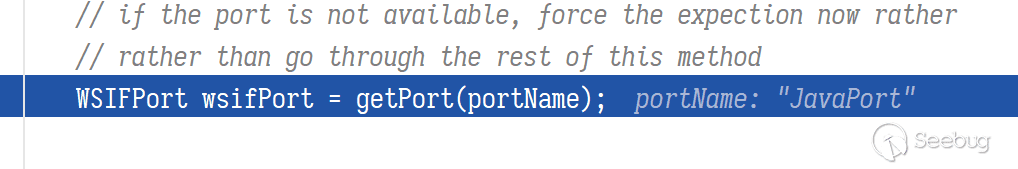 這里我們 WSIFPort 是 WSIFPort_Java,所以最終的實現類是 WSIFOperation_Java ,但是在這之前還會有個判斷,就是會根據我們選的 port,找到 bingding,在遍歷 binding 里的operation 元素,必須要有一個 operation 的名字和正在調用的方法名一致,不然就會直接返回,到這里我們看到都是對 wsdl 中 operation 名以及參數類型的限制而已,下面是 WSIFPort_Java 這個類的實例化
