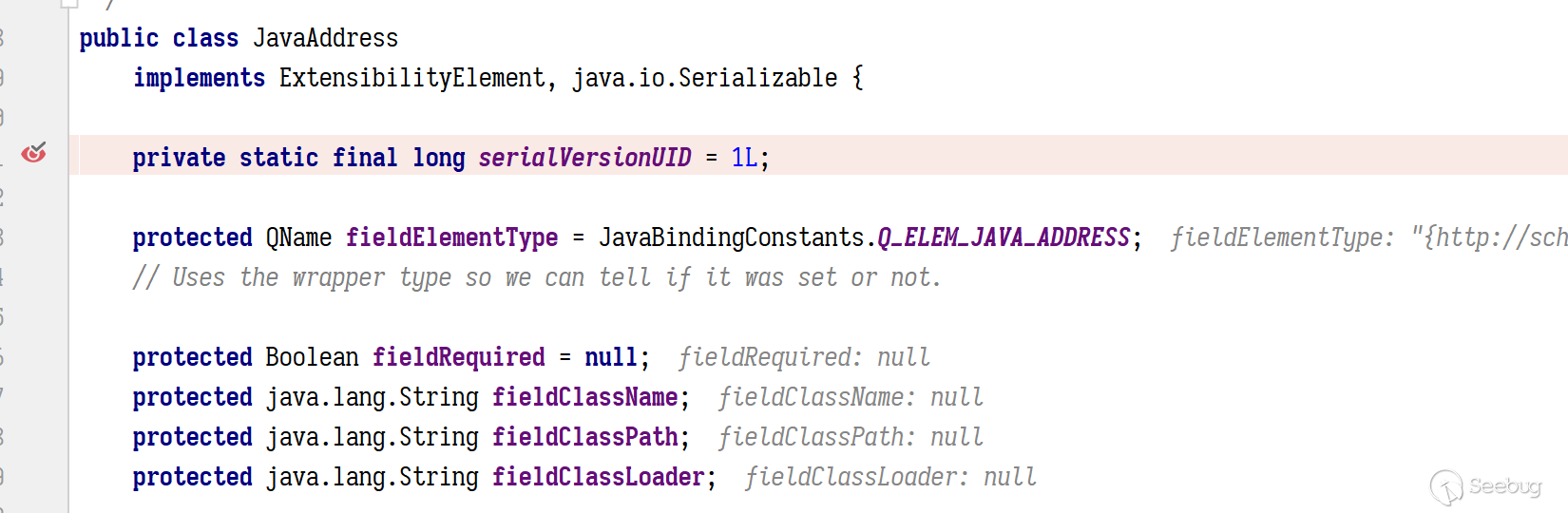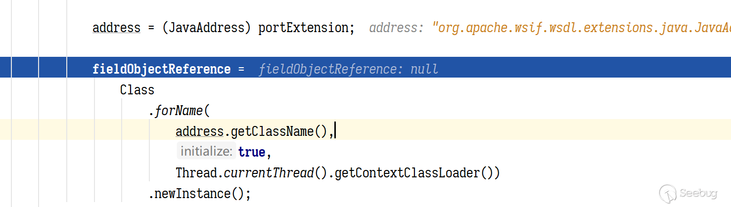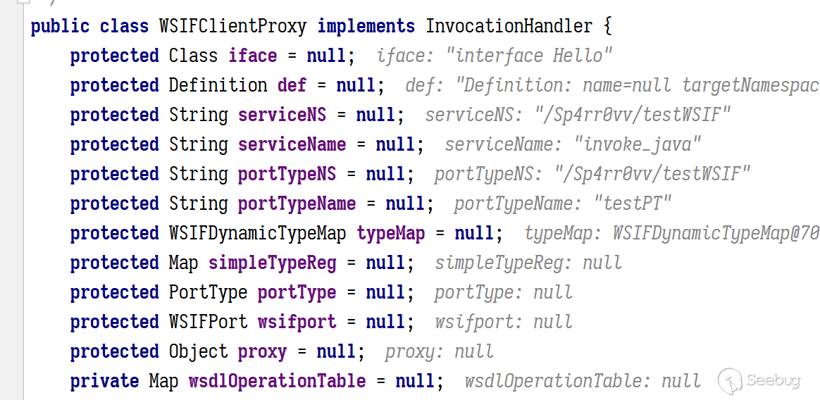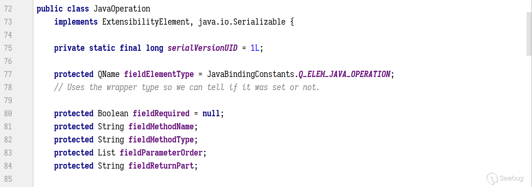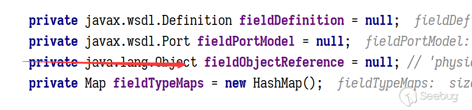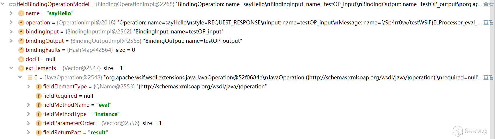 這個類有個叫 fieldObjectReference 的字段很關鍵,后面我們會看到它就是我們在 WSDL 中 <java:address > 這個元素中指定的ClassName的實例對象,也是最終執行方法的對象。