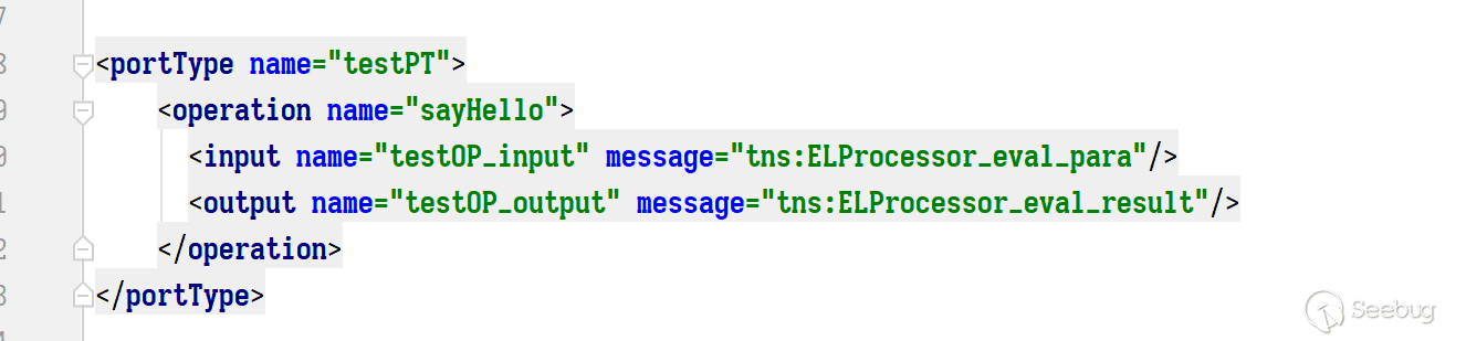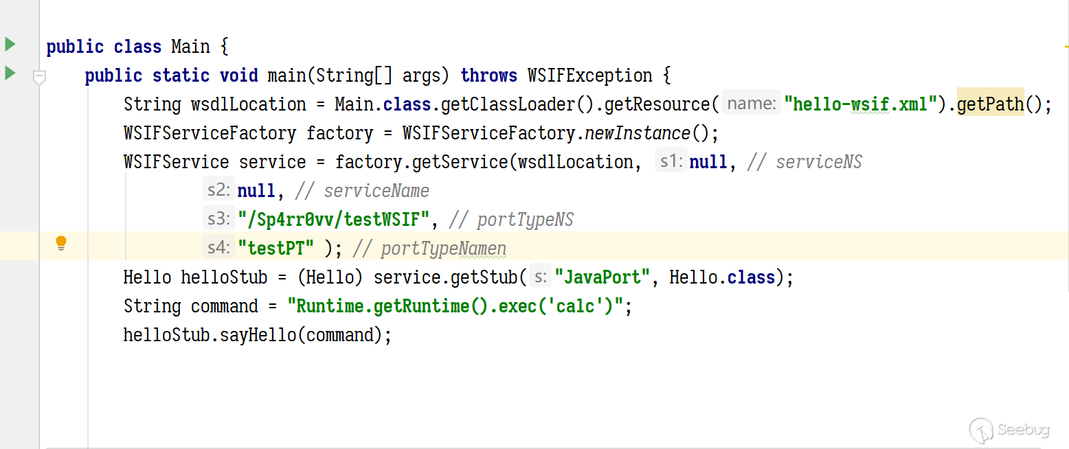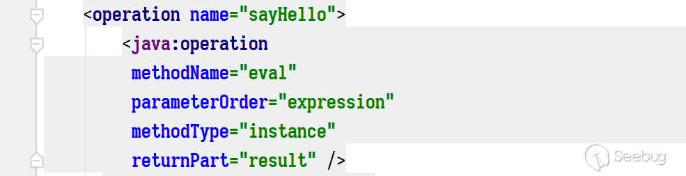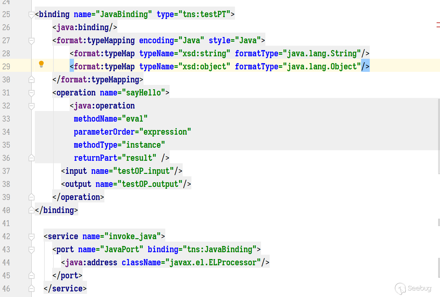 其中 java 命名空間元素是關鍵要素,其中包含了實際執行方法的類和方法,后面我們將會看到 WSIF 如何將 Hello#asyHell(Sring name); 接口方法調用變成 ELProcessor#eval(String)。