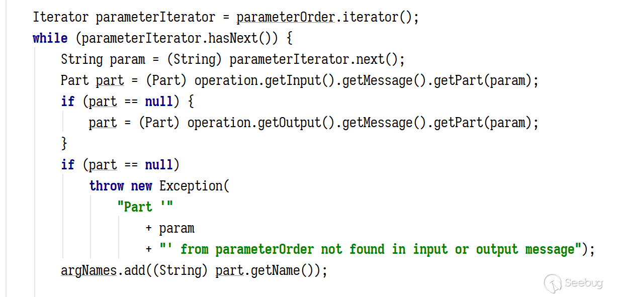 WSIF 會遍歷這個列表中的名字,根據當前選定的 WSDL 中的 operation 找到對應的 message 元素,然后會根據這個 parameterOrder 列表中的名字匹配其中的 part 元素的名字,也就是參數名,實例化這個元素指定的 type 成 Class 對象,放到返回值列表中,在一次遍歷的過程中,先是找到 input,匹配不上再找output,如果都匹配不上就報錯,到這里我們看到了第三個限制,就是指定了 parameterOrder ,那么對于與其相匹配的 operation 中的 message 中定義的參數名一定要和 parameterOrder 中的一致,至于 returnPart 這個屬性有無都行