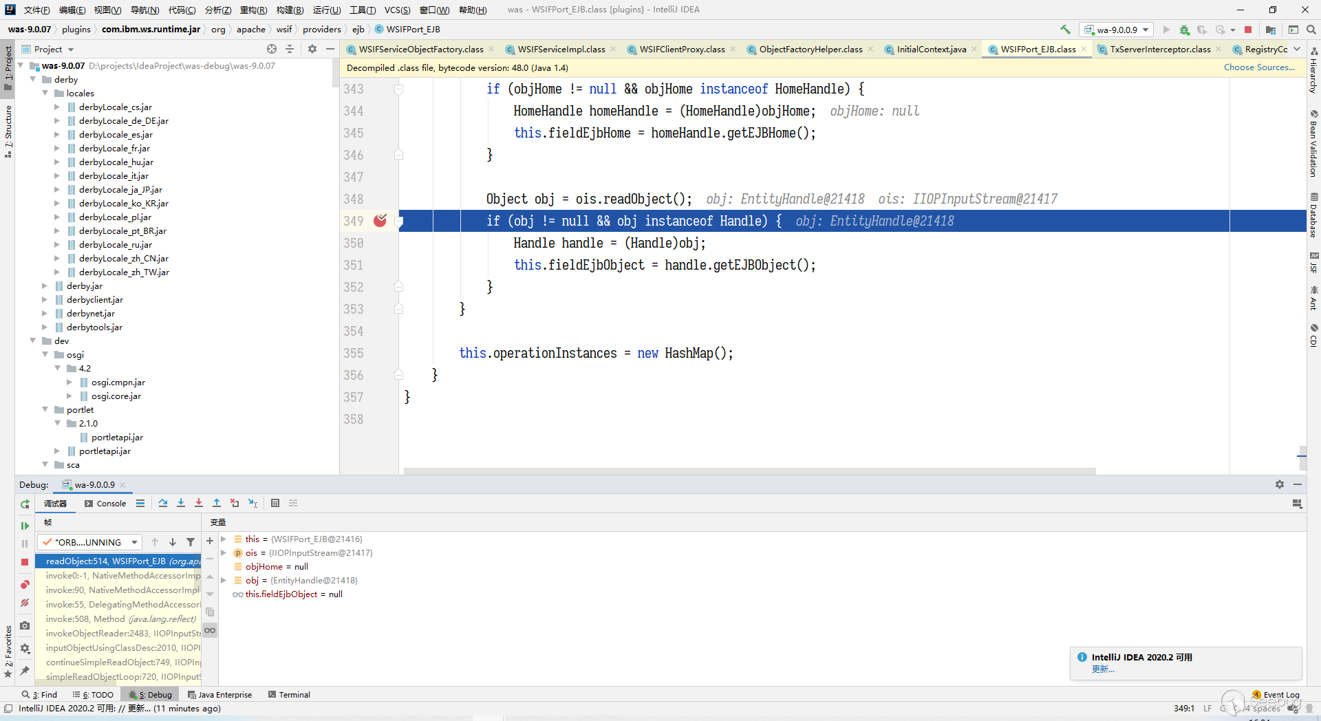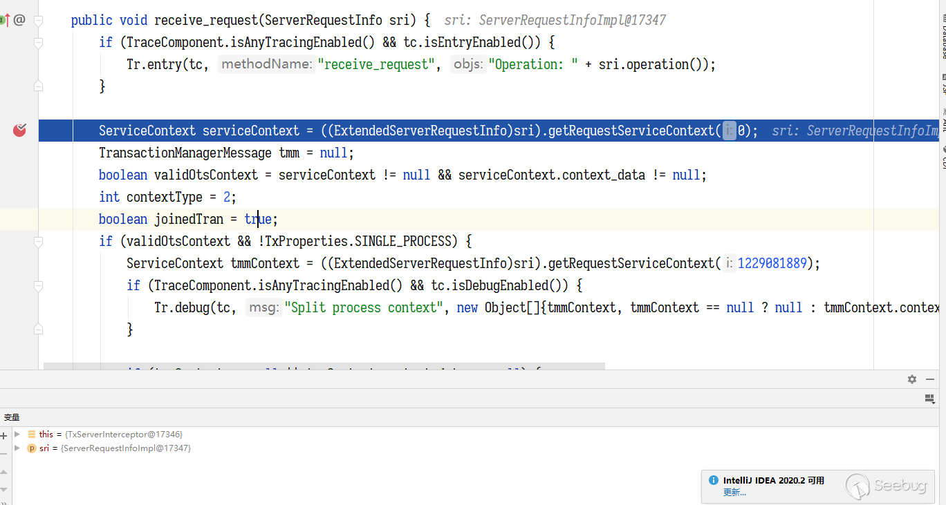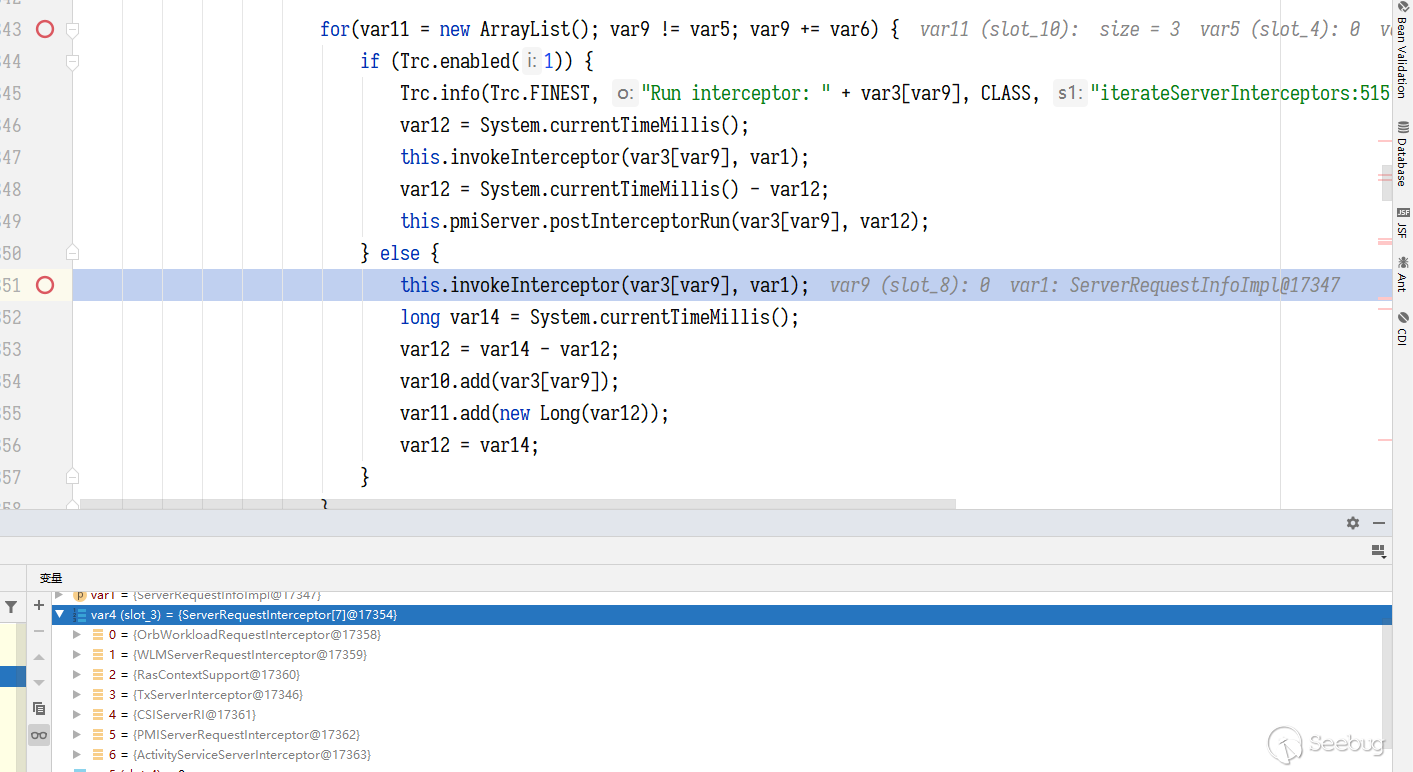 問題就出在這里,因為本質上,要進入到本次的反序列化調用點,根本是不需要一個 LocateRequst 的,我們可以 debug 看一下,在 WAS 的服務端在接受 iiop 請求時,會先經過幾個攔截器的處理,默認情況下一共7 個攔截器
