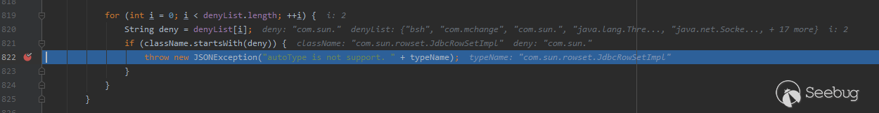經過動態調試可以發現,程序在執行到com/alibaba/fastjson/parser/ParserConfig.java 中checkAutoType安全機制時,com.sun.rowset.JdbcRowSetImpl類會觸發黑名單,程序將拋出錯誤