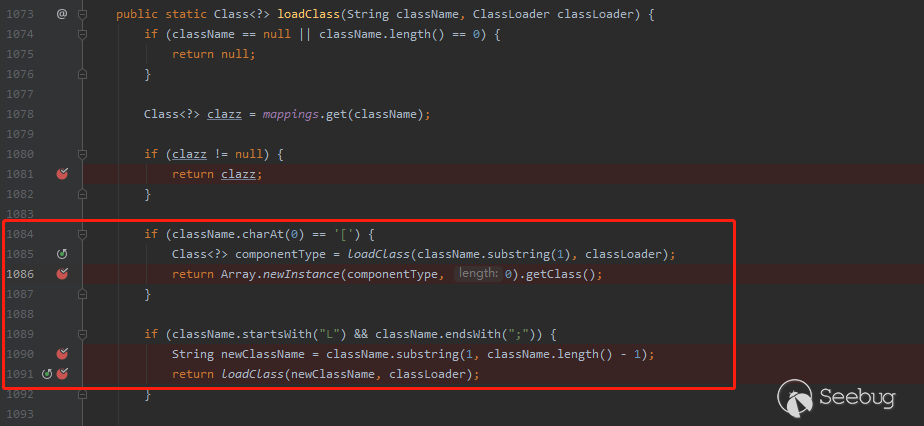 在這里額外介紹一下:當程序經過黑白名單的校驗之后,接下來會通過TypeUtils.loadClass方法對類進行反序列化加載