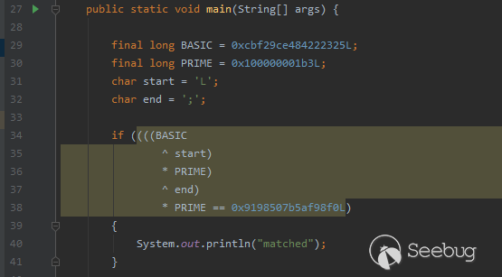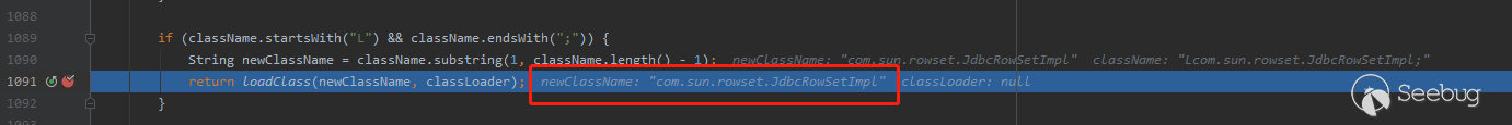 又看到熟悉的剝皮操作了,我們不難猜測到這兩個滿足條件的字符大概率是”L”與”;”。開發者的用意大概是想針對于1.2.41版本的利用”Lcom.sun.rowset.JdbcRowSetImpl;”,先剝去傳入類名首尾的”L”與”;”, 以便將惡意數據暴露出來,再經過黑名單校驗。