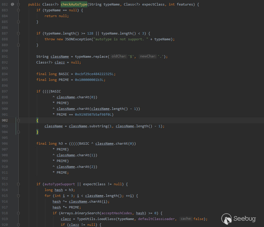 通過上文對checkAutotype安全機制的解釋可以發現,@type字段值首先會經過黑白名單的校驗。在成功通過校驗之后,程序接下來會通過TypeUtils.loadClass方法對類進行加載