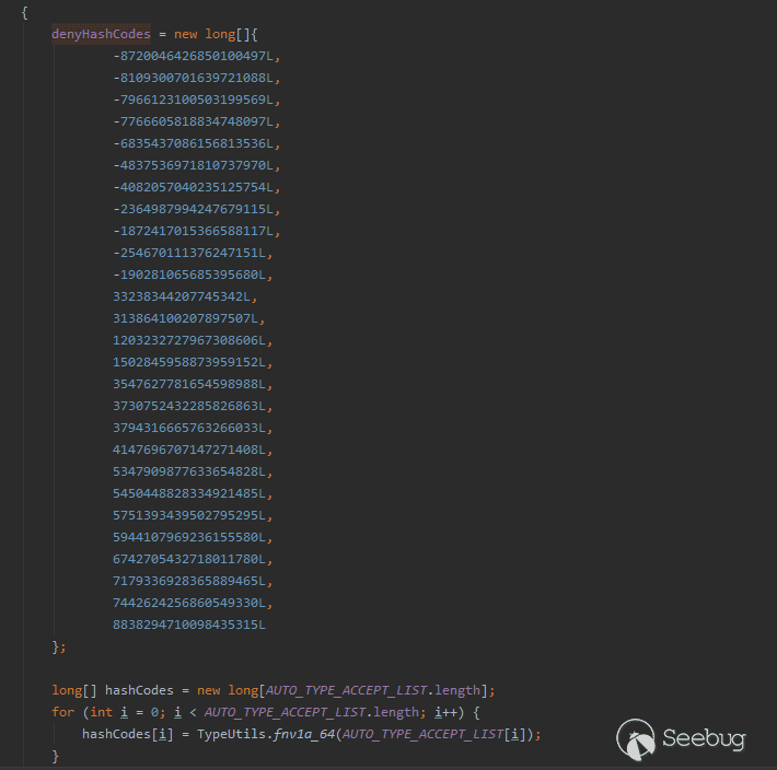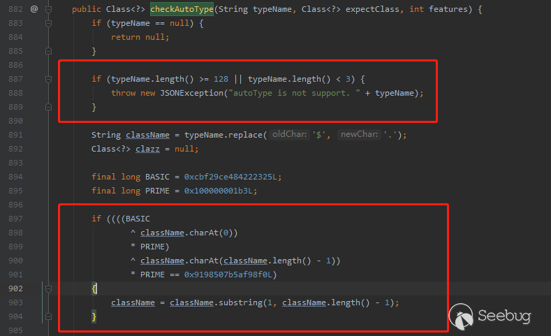官方主要的修復方案是引入了checkAutotype安全機制,通過黑白名單機制進行防御。在隨后的版本中,為了增強漏洞繞過的難度,又在checkAutotype中采用了一定的加密混淆將本來明文存儲的黑名單進行加密。