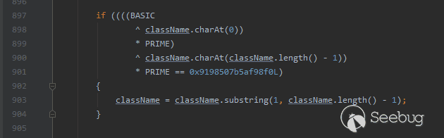 與之前的版本相比,這里多出了上圖這一段代碼。從代碼上大體可以猜測出來,這是用來判斷類名的第一個字符與最后一個字符是否滿足一定條件,然后將首尾剝去