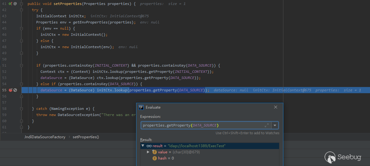 在上圖setProperties方法中,程序將取出poc中構造的DATA_SOURCE值并觸發漏洞