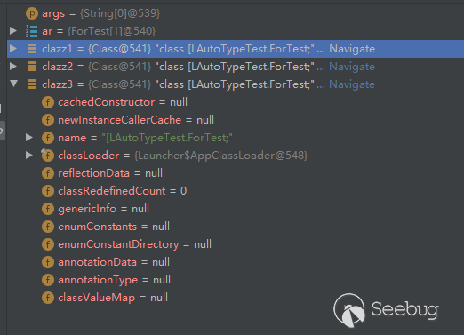 通過調試結果可見,clazz1、clazz2、clazz3的name是一樣的,都為”[LAutoTypeTest.ForTest;”