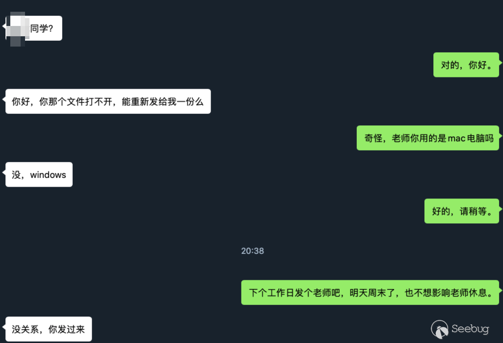 下?的圖?展示了當與受害者“交流溝通”?段時間后,已經完全“掌控”了對?,甚?對?在周末問我要簡歷時,為了防?客戶機周末不間斷的關機休眠,特地美名其?的說不想打擾到對?,等到?作?再投遞相關“??”: