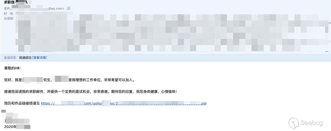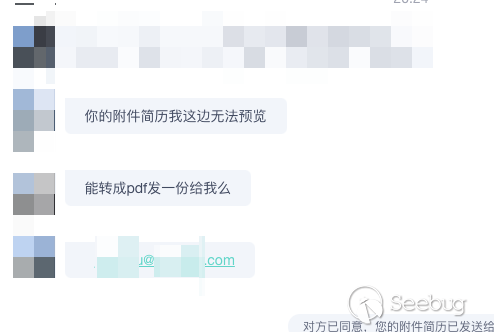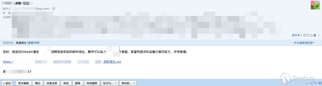 4、簡歷擁有分發屬性。我們在多次釣魚項目中發現,當你投遞的簡歷到非對應項目人的郵箱里時,他會幫你轉發,甚至有些熱心的HR還會幫你錄入到內部人才庫,這相當于一下子從不可信變成內部可信了,這也是簡歷投遞釣魚有意思的地方。