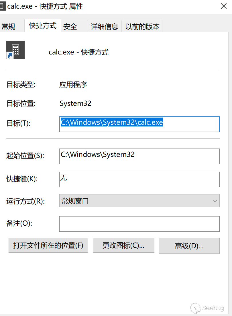 下圖為calc.exe的快捷?式的屬性信息,我們可以在“?標”欄寫???的惡意命令,如powershell上線命令: