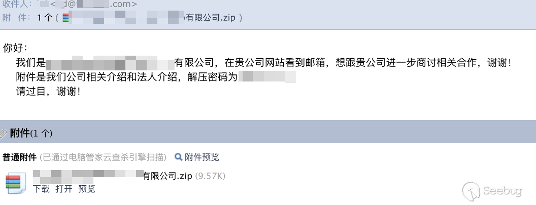 我們進?釣?攻擊時,會常常把??直接放在郵件正?中,但是對?郵件?關可能有殺軟沙箱,會攔截帶有惡意?件的郵箱,這時候可以嘗試對?件進?加密處理。