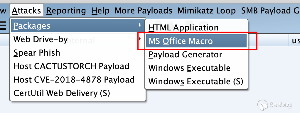 在word中可以植?宏來達到運?宏上線的?的,?cobaltstrike也正好?帶了這種攻擊?式: