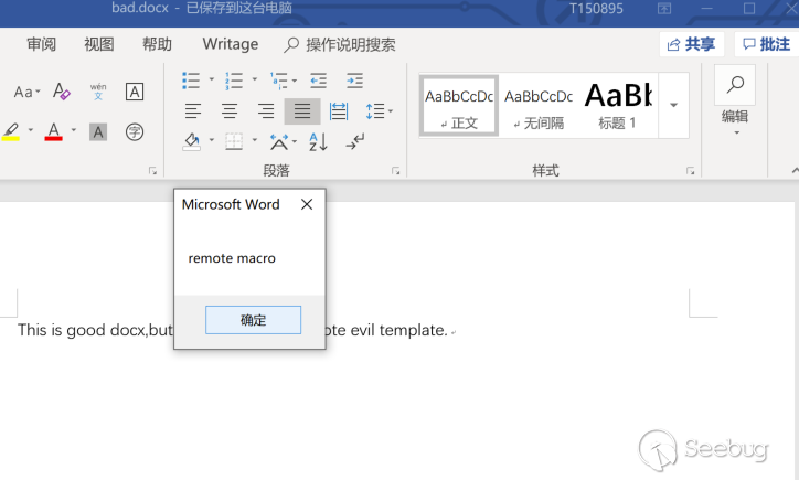 利?遠程模板,因為不具備惡意宏代碼,文件本身成功繞過了某殺軟。