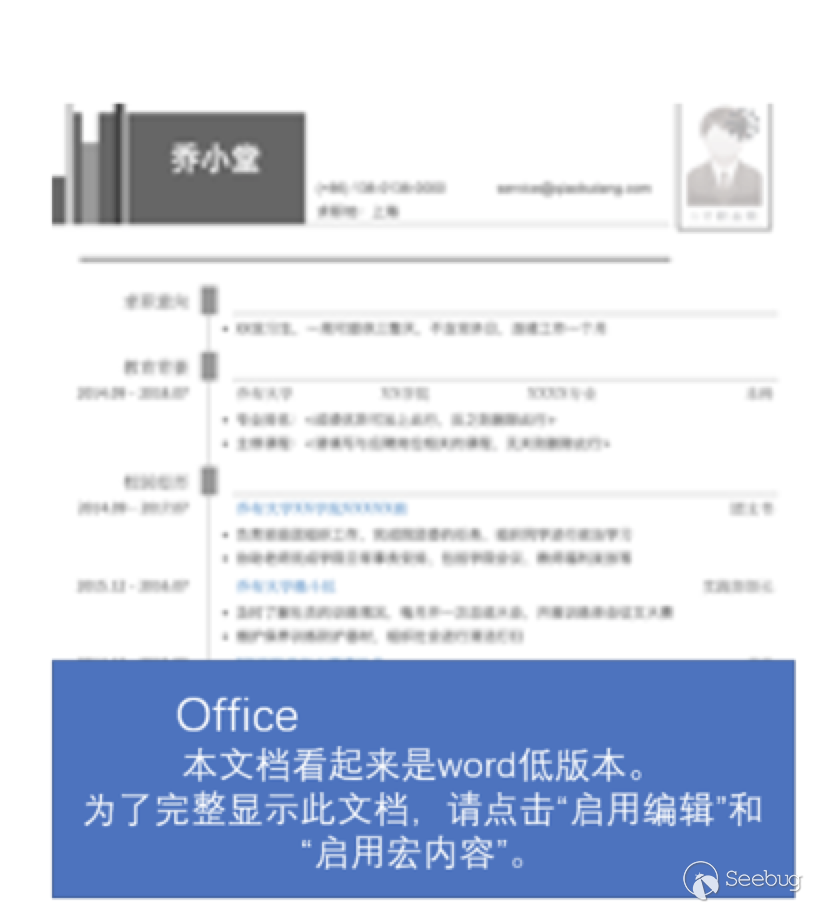 我們可以嘗試使?如下?段,背景為?個虛化的簡歷圖?,然后在上?再加上?段?字,意思告訴受害者,這是?份簡歷,但是因為你沒點擊宏運?,所以看不清,要想看清,請點擊運?宏: