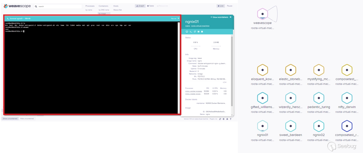 上圖是Linux服務器的Weave Scope可視化效果。左側是基于Nginx的容器的開放式終端。右邊是服務器上所有容器的視圖。
