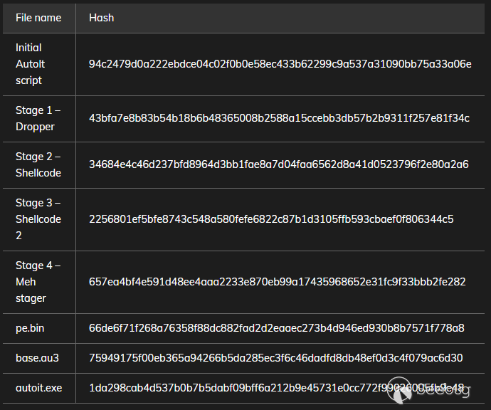 第一部分是解密器,我們將其命名為MehCrypter,它由多個階段組成,并作為已編譯的AutoIt腳本進行分發,以隨機生成的字符串序列作為前綴。AutoIt解釋程序將跳過此字符串序列,該解釋程序將掃描確定文件格式的字節并有效地混淆文件,而不會影響其功能。