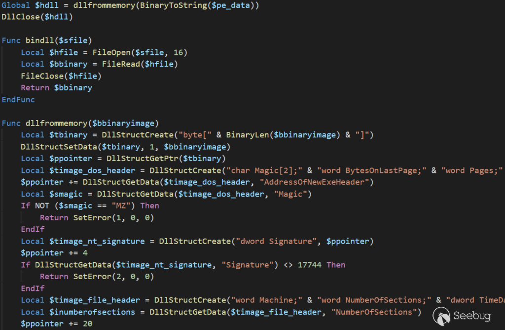 反編譯產生了一個非常可讀的腳本,該腳本具有一個目的:連接硬編碼的十六進制字符串,對其進行解碼,并通過自定義AutoIt PE加載器使用反射加載來加載結果PE。