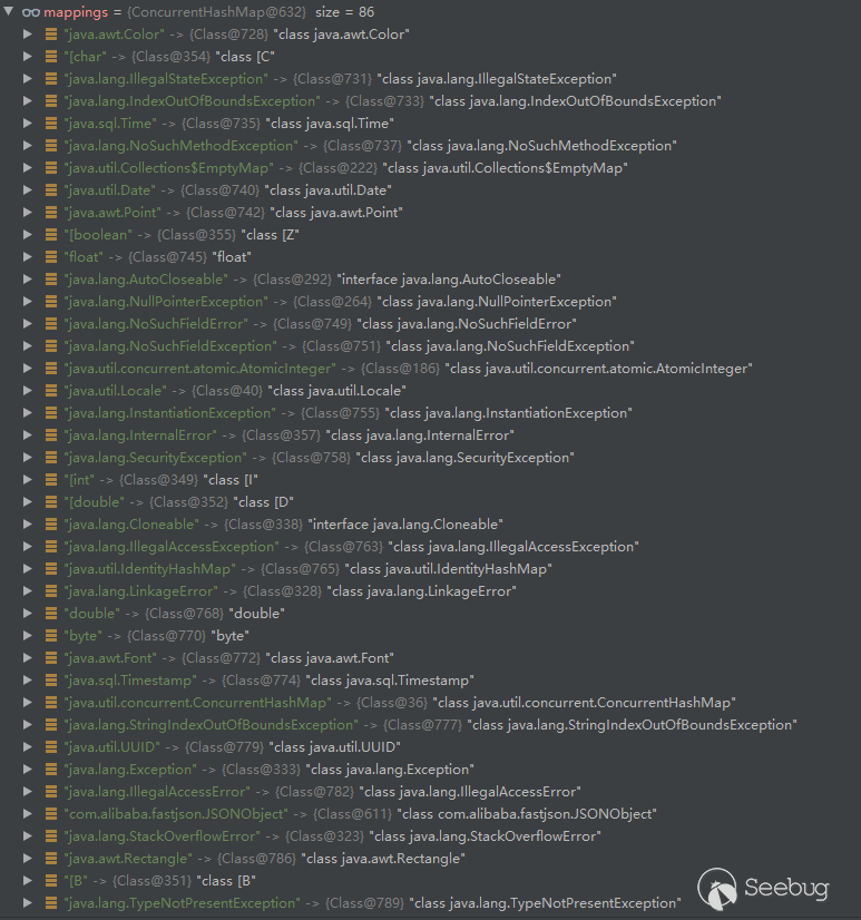 經過調試發現,mappings中存儲的數據是由位于com/alibaba/fastjson/util/TypeUtils.java的addBaseClassMappings方法添加的。