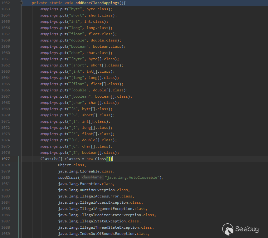 從Mapping集合中的數據可以猜測,Mapping是用來存儲一些基礎的Class,以便于在反序列化處理這些基礎類時提高效率。