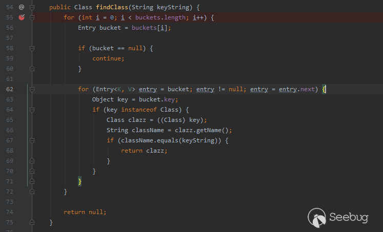 我們跟入位于com/alibaba/fastjson/util/IdentityHashMap.java的findClass方法進行進一步分析。