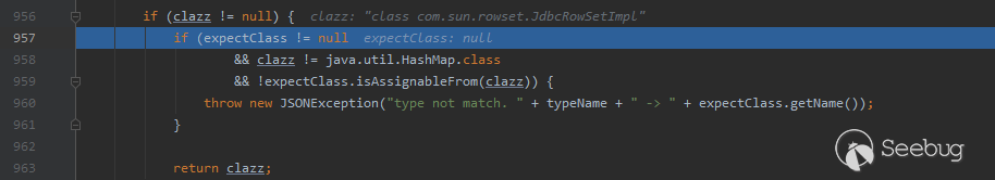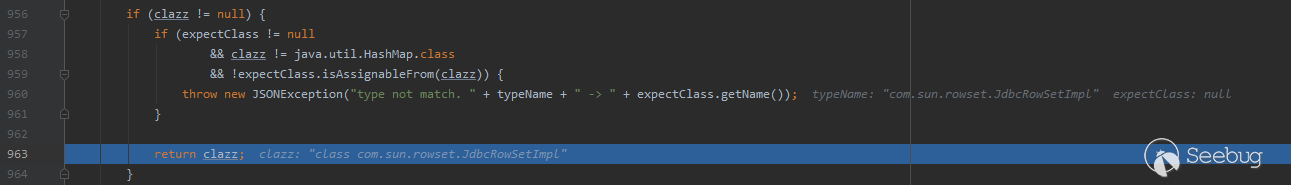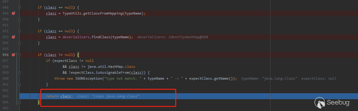 在findClass執行完成后,java.lang.Class類對象被返回到checkAutoType中并賦值給clazz,checkAutoType方法也將于963行處將clazz返回。